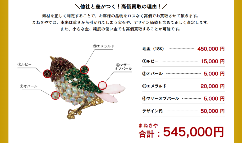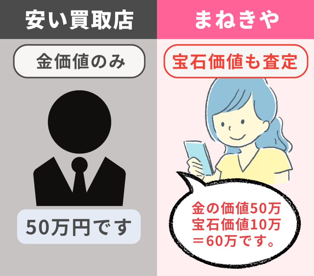 まねきやでは宝石の価値も査定して買い取ってくれるので、金だけの価値で買い取ってもらうより高くなります。