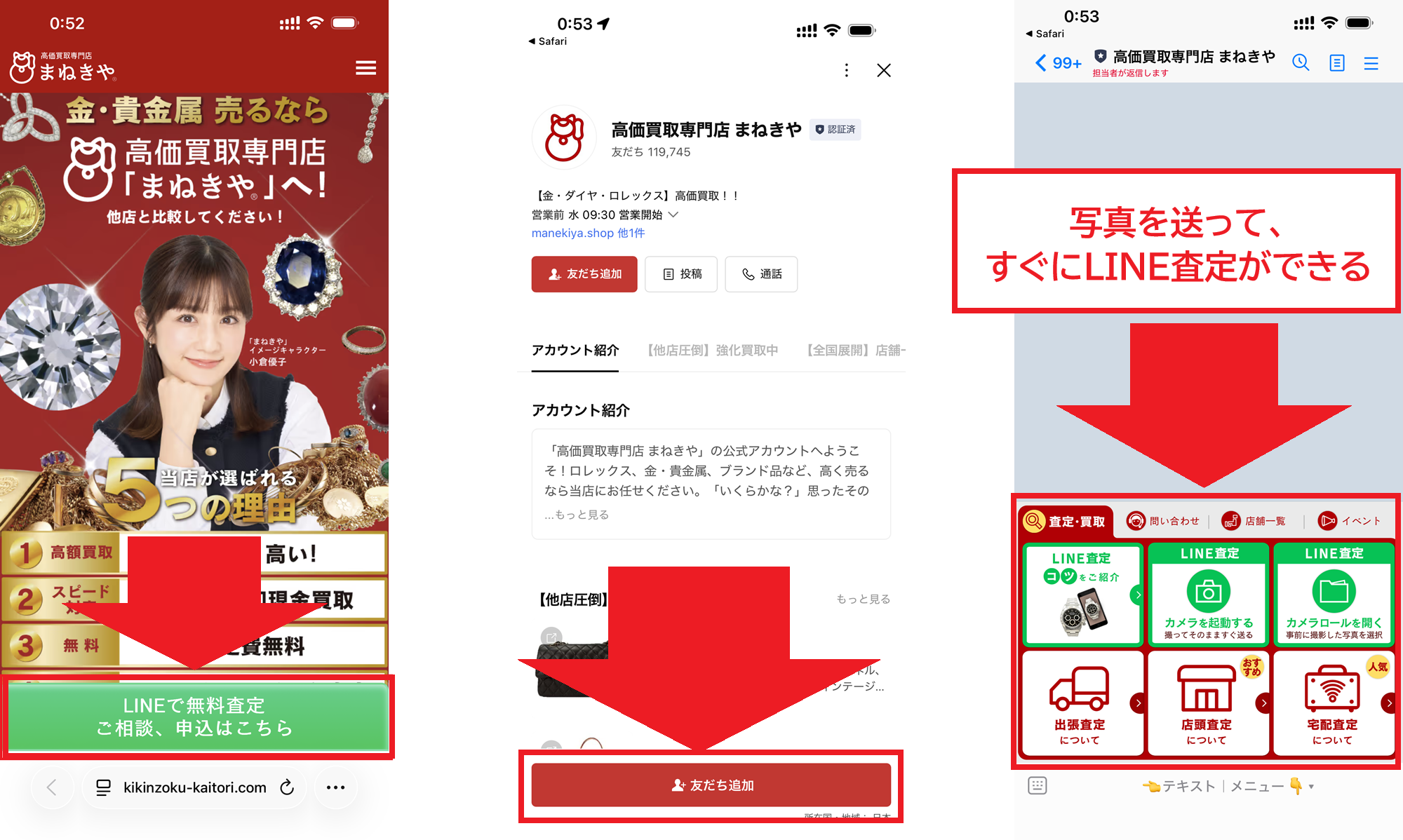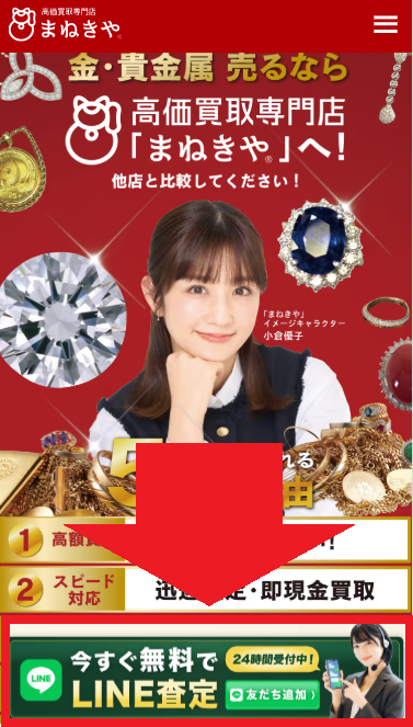 まねきやの無料査定は「LINE査定」「宅配査定」「出張査定」「店舗査定」どの方法でも公式サイトの「24時間受付可能!LINEで無料査定」を押してLINEから進めることができます。