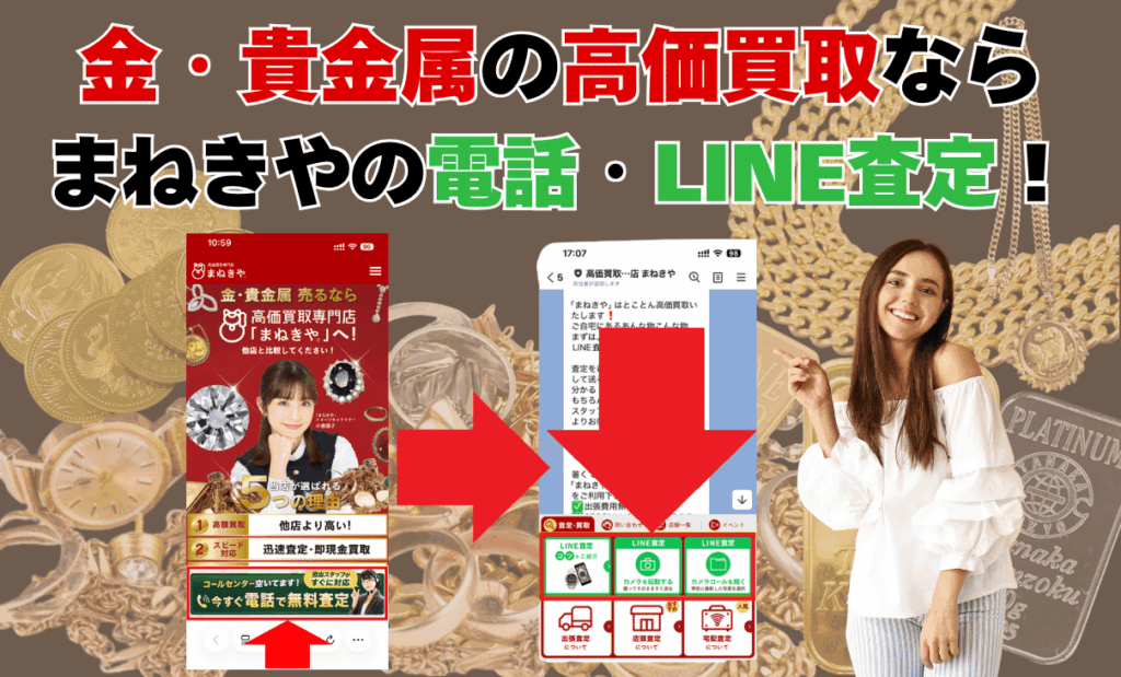 査定は24時間受け付けているので、売りたい商品をまねきやのLINE査定に写真を送って、金・貴金属の査定額を見てみましょう。