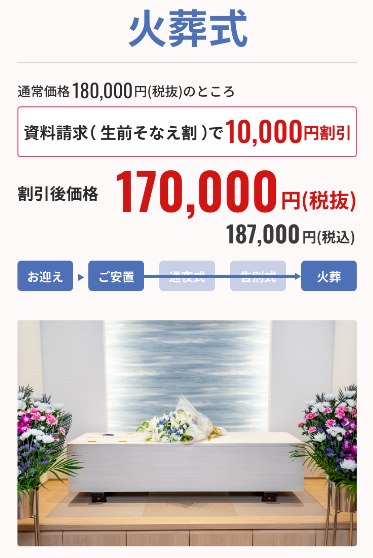 | 火葬式(告別式なし・お通夜なし) | →生前そなえ割で170,000円 |