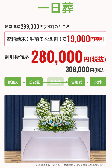 | 1日葬(お通夜なし) | →生前そなえ割で280,000円 |